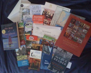 On Friday, I received a package full of goodies. You might remember I won the Map of True Places Sweepstakes for Brunonia Barry's newest book, The Map of True Places. It's hard to tell what all is in the picture above, but the prizes included