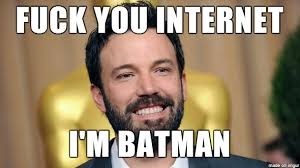 You guys. YOU GUYS. You know it’s just a movie, right? Like, yes, I get it, people get all invested in their stories. I get it. I guess I just don’t have that in me. I mean, I was super-sad when the movie version of A Prayer for Owen Meany was THE WORST THING EVER ZOMG, but I didn’t go online and put up memes about how we needed to murder Ashley Judd, either. THERE ARE MEMES ABOUT MURDERING BEN AFFLECK. OVER A ROLE IN A MOVIE.