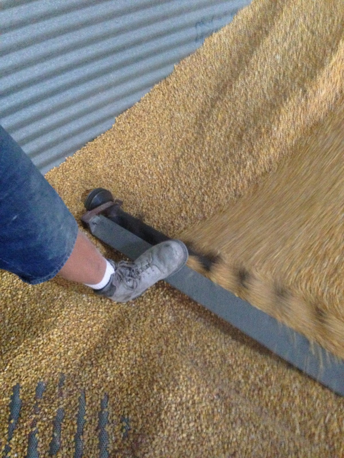 The main objective in cleaning out a bin is to keep pushing the auger into the corn, keeping in mind that it spins fast enough to rip off your arm, foot, or any other appendage you would accidentally touch it with. You do not want to get a pair of jeans caught in that baby. I almost had a heart attack when the broom slipped from my hands and nearly dropped into the spinning metal disk of death.