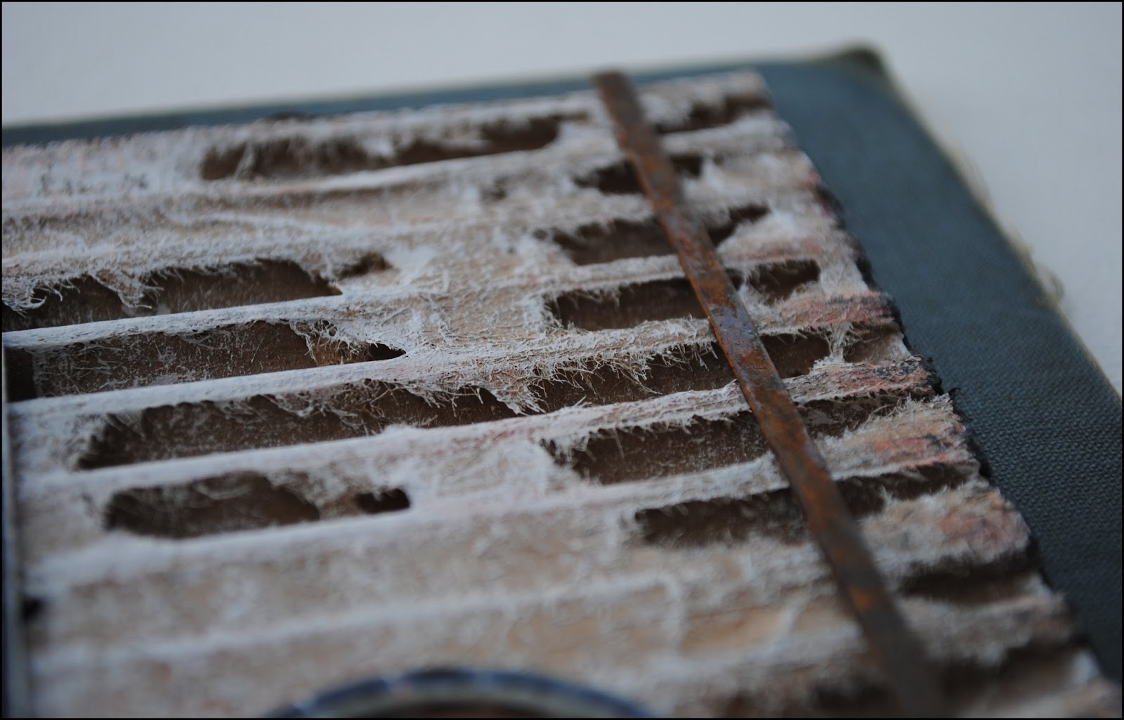 Other: card stock, corrugated cardboard, vintage book cover, gesso, paint brush, found metal embellishments, adhesive, scissor, craft knife