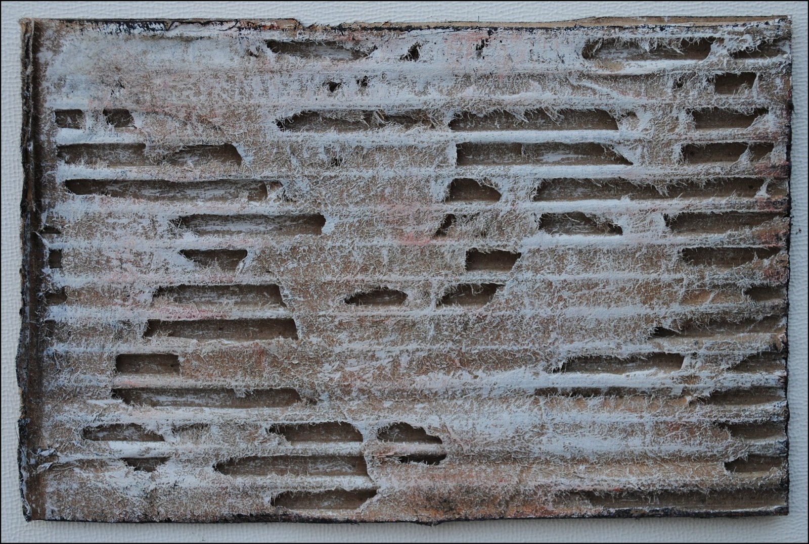 --------------------This piece started with a section of corrugated cardboard from a shipping box. I cut it to a size of approximately 4 1/2 x 7 inches and then tore away part of the smooth cardboard surface.