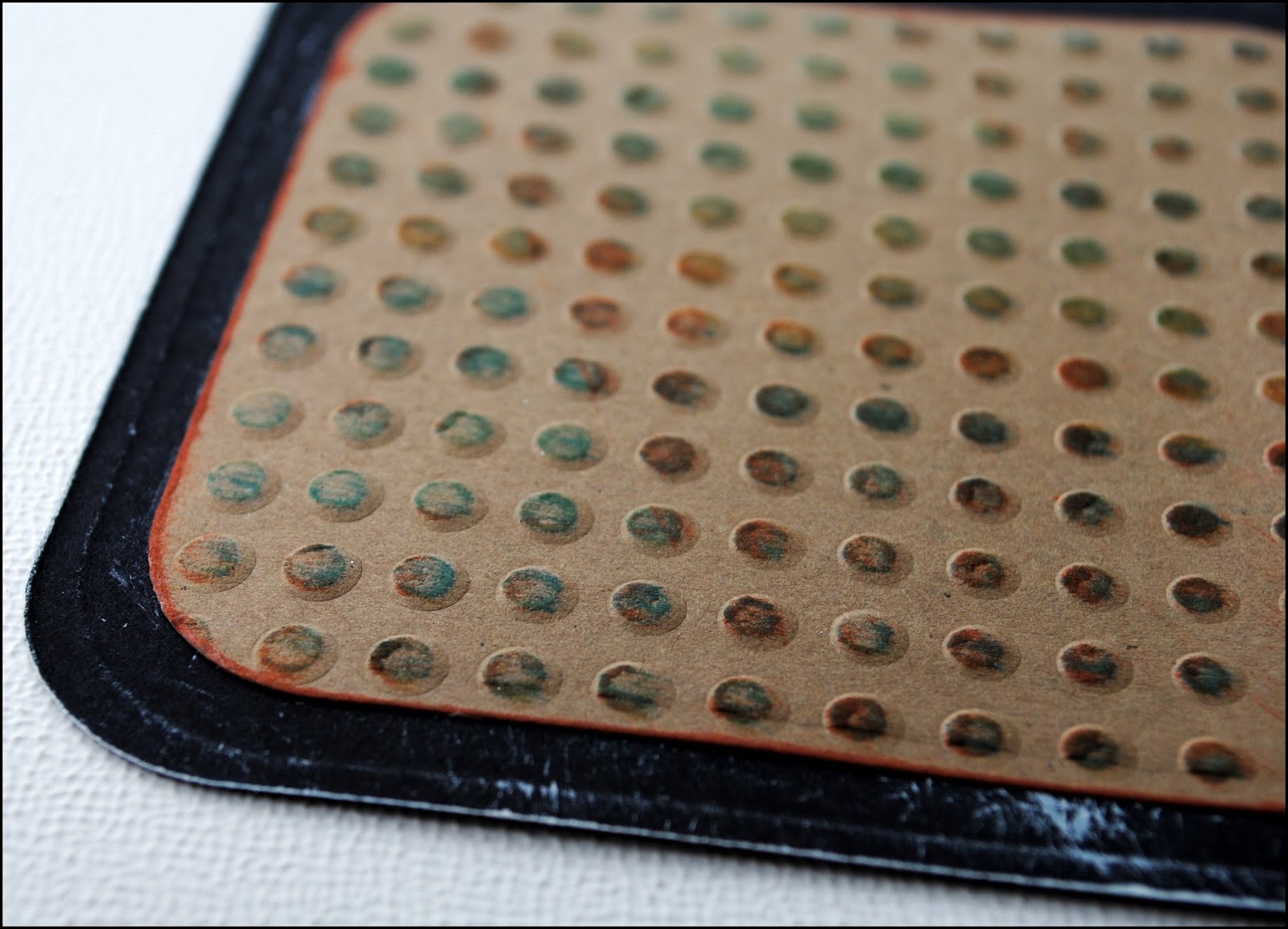Adding another textural element to the piece, I used a Spellbinders M-Bossabilities folder to create a deeply embossed grid of dots into a sheet of kraft-color card stock.