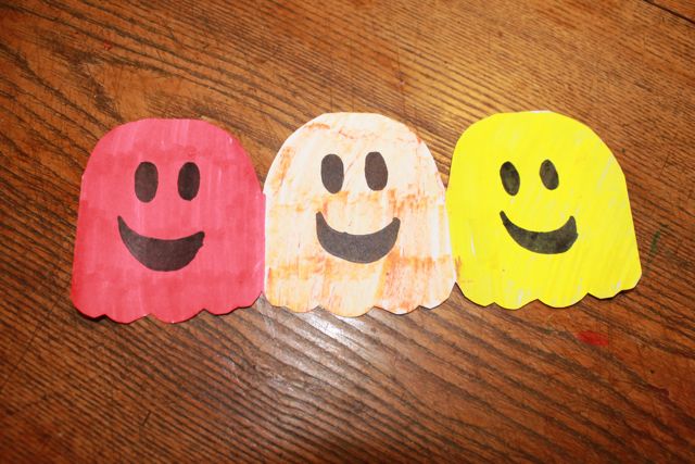 Today my son and I were coloring, cutting, and creating cards for Mom. In the middle of the madness of spilling crayons and flying paper scraps, I had the idea to make a paper doll chain of ghosts.