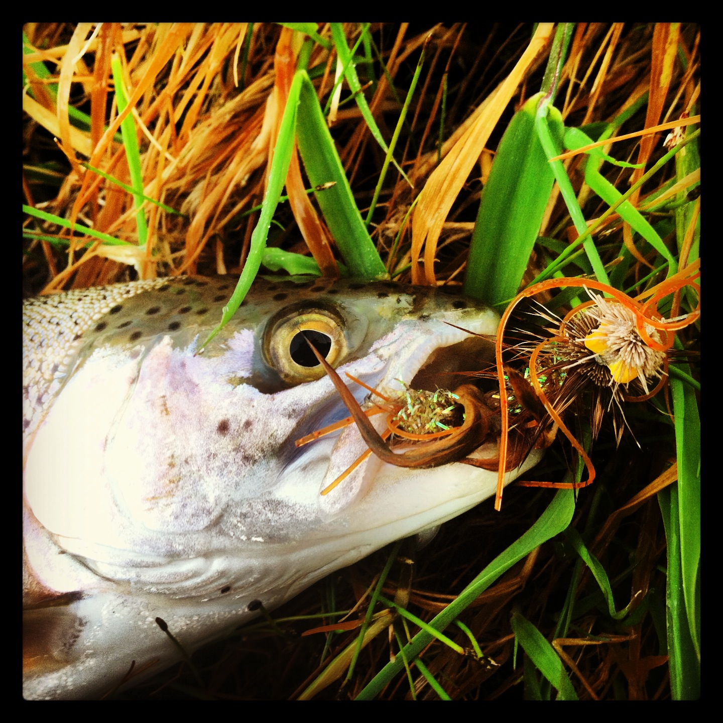 A chubby rainbow caught on one of Galloup’s Crawl Daddy’s, which is an articulated streamer tied to imitate of crawfish.