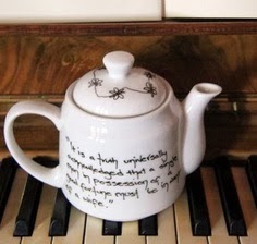 Una digna tetera con una cita del libro grabada en ella.