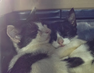 About two months ago, my daughter looked out her apartment window to see a mama cat and three kittens on her patio. Then the mama cat and one of the kittens went away, leaving these two guys...