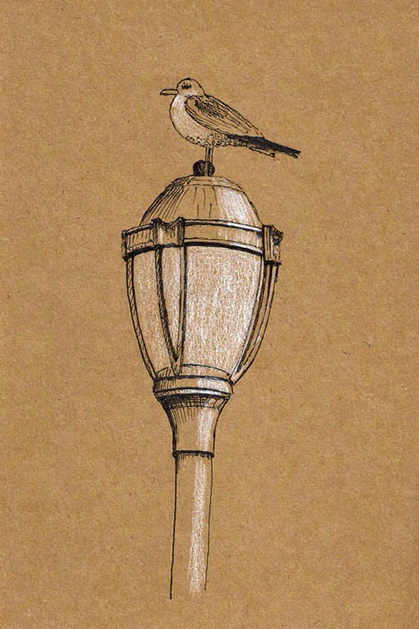 In the meantime I’ve been doing some sketching. I received a handmade tan-paper sketchbook from my buddy Pat Ng in Singapore and did this sketch to sort of break it in. The gulls love to sit on the lamp posts around here so I had plenty of source material for this sketch.
