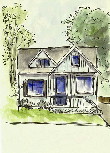 I spent Monday night looking at a bunch of sketches done by Liz Steel, a very talented architect/sketcher. She talks about how she works very quickly and why. The next day I was walking down a street and saw this little house. I decided to try out Liz’s philosophy/approach and while I didn’t produce anything near the quality of her sketches, once I buried the ‘ooooo…that’s not right’ and ‘oops…left that out’ I found the results interesting and I’ll probably do some more like this. Took less than 10 minutes, including the time to get out my watercolor kit and waterbrush. It was done in my ‘el cheapo’ 3×5 notebook and my Uniball UM-120 (.5) pen.