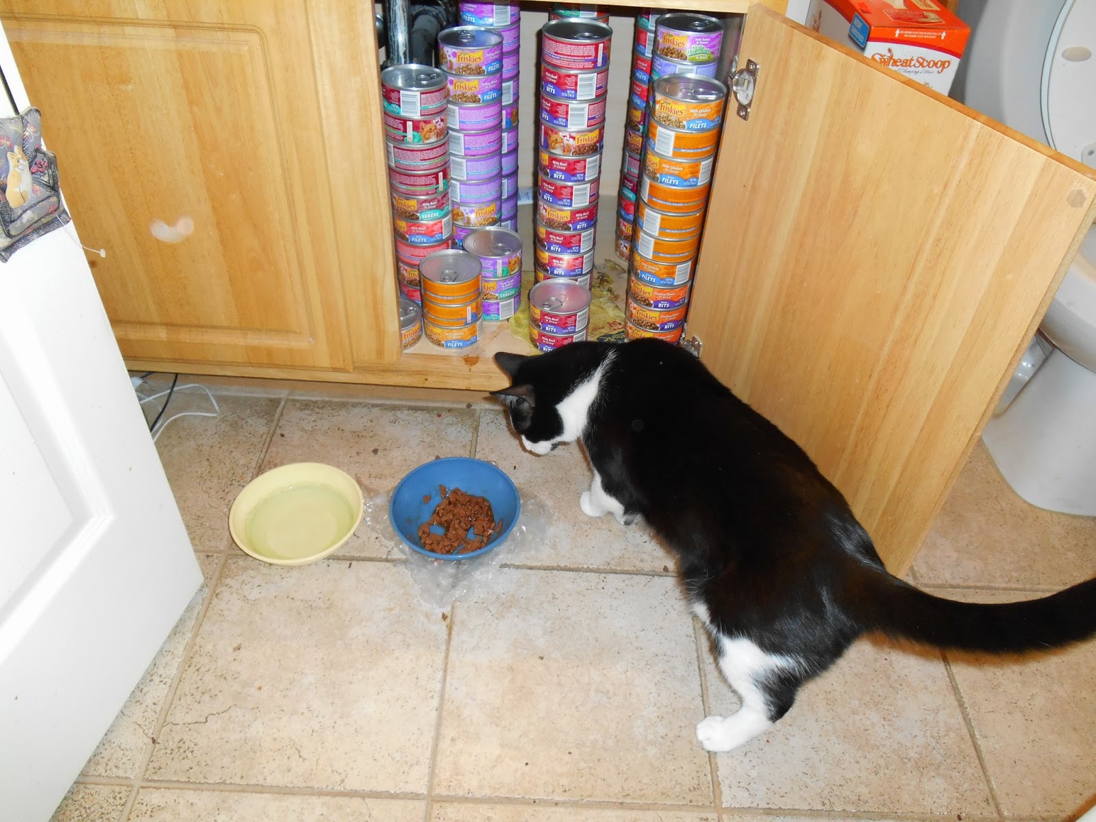 Last week, when I felt my life was spinning out of control (as opposed to this week, when I know my life is spinning out of control), I decided to focus on the important things and organize Scooter's cat food. I took each and every can out of its plastic shopping bag and piled them by flavor.