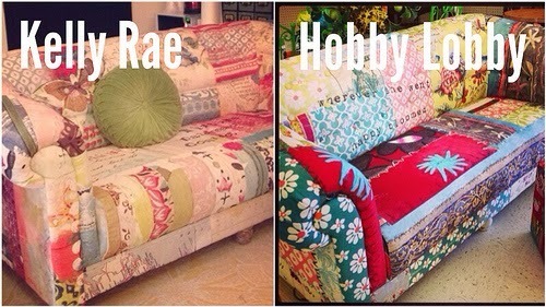 One season following the debut of my funky artful/patchwork couch with typewriter sentiment, mega store Hobby Lobby debuts their version - literally the same construction/style of couch, also with patchwork, also with typewriter sentiment. I certainly don't have any ownership over "patchwork" but my goodness, the similarities/timing are uncomfortable in this instance. It may not be a perfect copy, but it has definitely caused market confusion as evidenced by the several emails that came in wondering if it was my couch at Hobby Lobby stores.  They refuse to take responsibility, which is disheartening especially considering their founding principles and commitments.