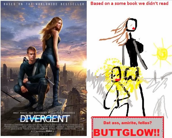 And this is what Summit Entertainment give us for the film poster. "Hi! My name is Tris Prior - but my love interest there, the guy with the giant gun? He is clearly more important than I am, since he's right at the front of my poster. In order to show that I'm not one of those awful, unsympathetic, domineering women, I'm going to stand behind him, completely unarmed, with my back to you, while coyly looking over my shoulder. But enough about ME! The important thing here is that you can clearly see my boobs AND my butt! Do you like my butt? They lit it specially, defying all the normal laws of light and shadow, and placed it at the exact centre point of this poster!"