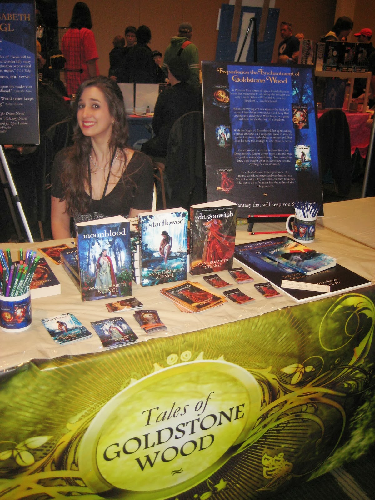 I thought you might all enjoy some pictures of how Comicon went for me and Rohan! As some of you saw in my Doings at Rooglewood post, poor Rohan was very sick over the weekend. But, being the magnificent trooper he is, he still drove me out to Durham on Friday night, carried in all the heavy boxes of books, helped me set up and arrange the table, nearly passed out for lack of breath, grinned, and carried on. He was so exhausted after that, we had a bit of trouble getting out the door on Saturday morning and thus were a few minutes late for the start of Comicon.