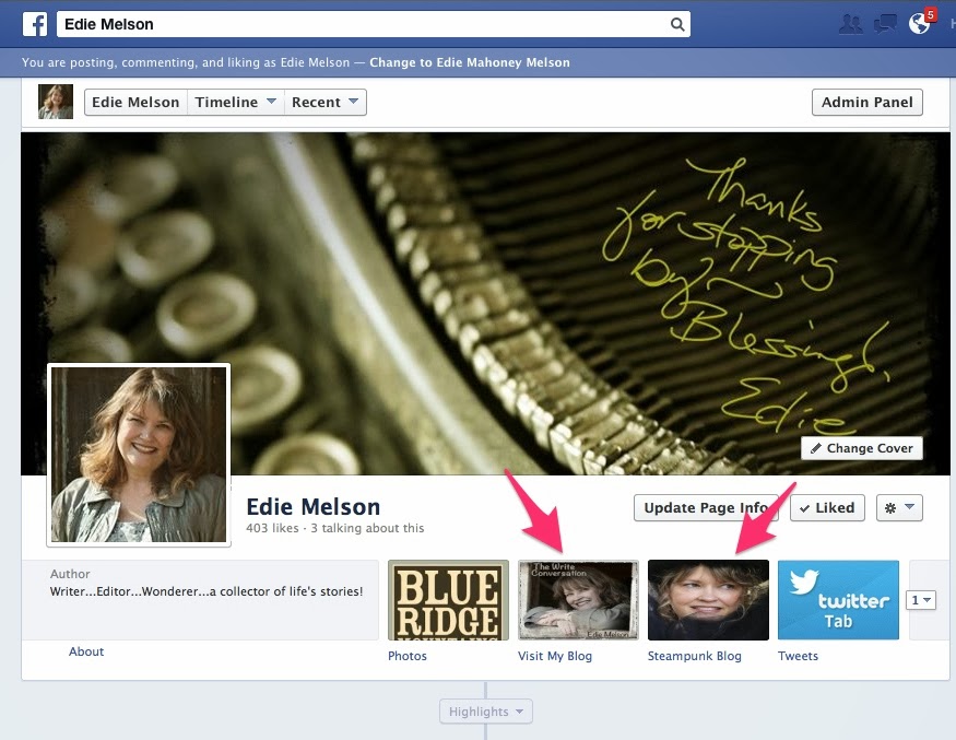 Above is a picture of my Facebook Page. The pink arrows point to the two tabs (boxes) that I linked to my blog sites. Unfortunately, FB doesn't make adding these custom tabs easy.