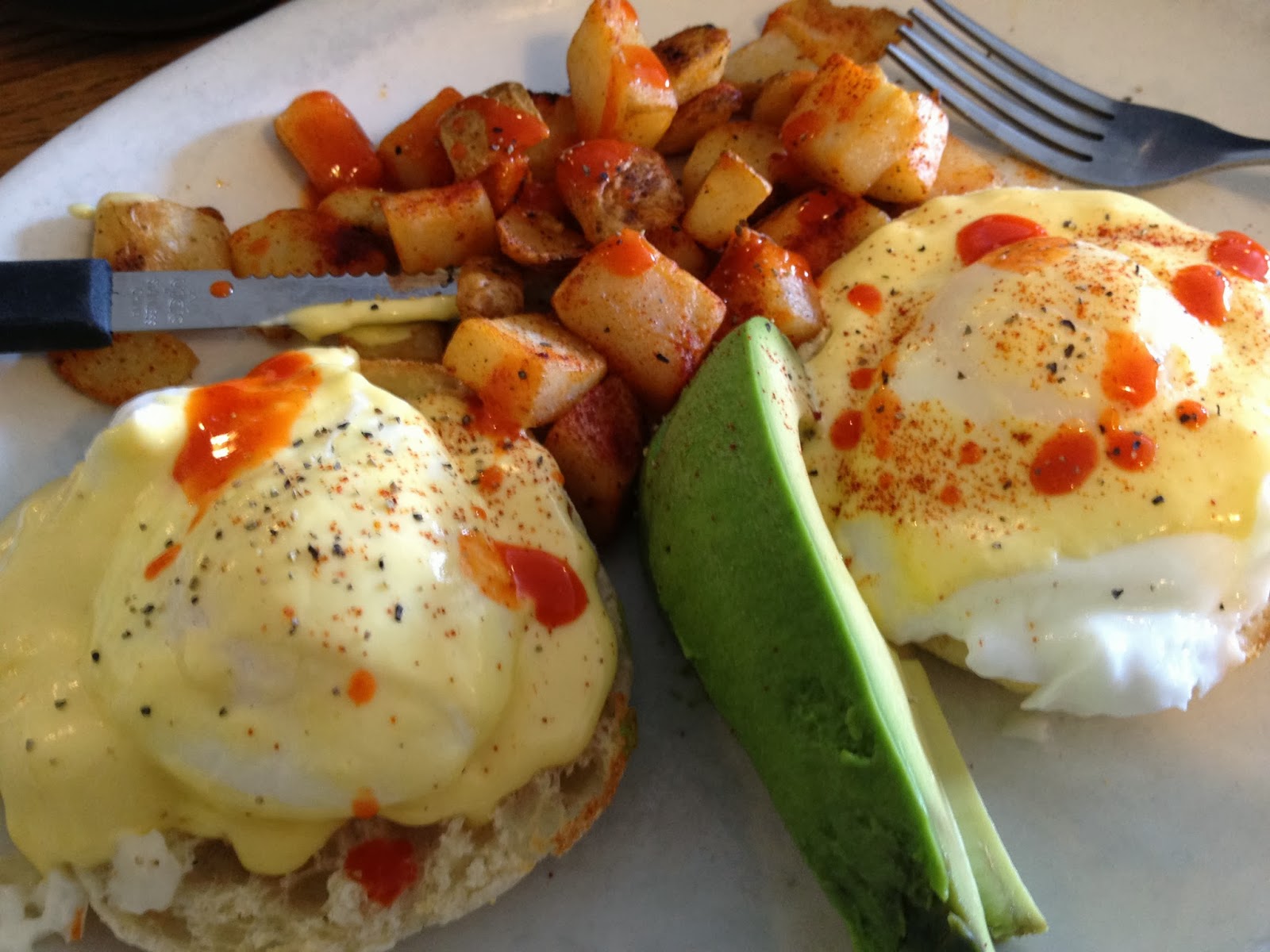 This was the California Benedict. That's English muffin, poached eggs, Hollandaise sauce and avocado. It normally comes with tomatoes, but I ordered without, because tomatoes are gross (unless they're in ketchup, salsa or marinara sauce). It also came with a side of country potatoes (or home fries if you like). I topped it with hot sauce, because I've recently discovered I like hot sauce on eggs (and pizza). It was all pretty delicious. And now I'm hungry.
