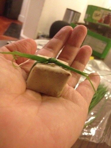 The idea was to open the meal with a festive gift. I sliced cubes of the salmon and then wrapped them using colorful soy sheets (our sushi chef introduced us to them years ago, now you can buy them easily in Asian groceries). I wrapped them exactly like using wrapping paper, and used a chive for a ribbon. We have one vegetarian guest. For her I fried a cube of tofu and then marinated it all day in soy sauce, sesame oil, and ponzu sauce, and wrapped it the same way.