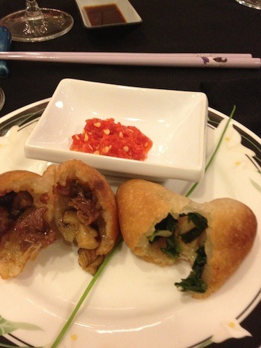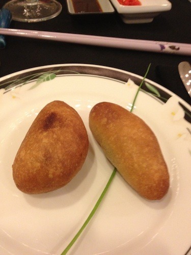 The white wine served with the amuse was for this course, too. This being duck day, we use duck in most things, so instead of a char siu pork, we made duck in a char siu preparation. Basically the same recipe but with a dash of Worcester sauce instead of oyster sauce (to accommodate kosher eaters). We made yuanxiao dumplings, which are the deep fried football shaped ones you get at dim sum but which according to the book ASIAN DUMPLINGS by Andrea Nguyen are traditional for the new year Lantern Festival. She also says at dim sum they’re often terrible, leaden and greasy. I highly recommend this book. I’ve now made several dumplings out of it that I’d never before attempted at home and all have come out delicious and her instructions on all the fussy things one has to do to get the doughs right are terrific.