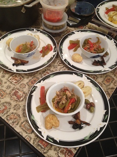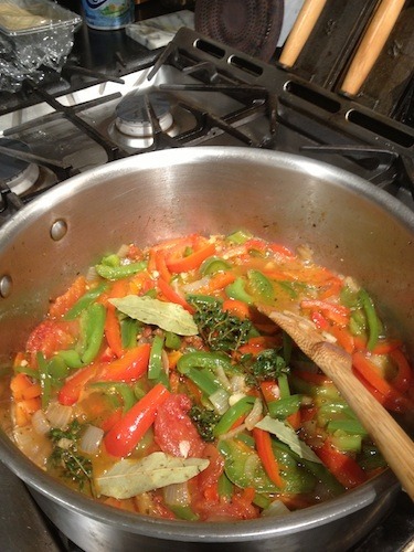 I sauteed all the non-duck ingredients (red and green peppers, onions, for tomatoes I used our house-smoked tomatoes, garlic, cumin, fresh thyme, oregano) into a sofrito, until everything was a little caramelized, then poured in about a quarter cup of wine to scrape up the caramelized bits. Then I poured in the other half bottle of wine. Forget using water or stock or broth, a half bottle of Cava that had gone flat and so was sitting around in the cabinet was perfect. I stewed all that for a while. 45 minutes? An hour? Until the liquid tasted unbelievably amazing. Then I let it cool a bit, shredded the duck confit and removed the bones, and combined the shredded duck with the stewed vegetables. Let it sit overnight in the fridge. The next day to serve it I warmed it up in the oven in a dutch oven while the previous course was being made, plated and served.