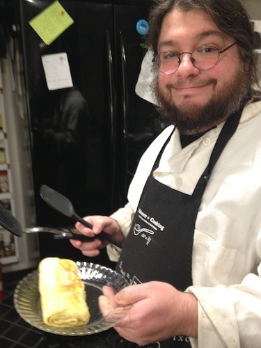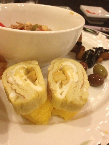 The other complex dish in the tapas course is the tamago torta. Torta is a traditional spanish dish made of egg, potato, and onion, often served cold at tapas. We couldn’t just do a traditional one, though: boring. We’re very fond of Asian fusion (some would argue I *am* Asian fusion) so hit upon the idea to do this as if it were tamago, the cold egg sushi. Tamago usually incorporates sweet rice wine: corwin reduced fino sherry instead, and added a core of potato and onion sauteed in smoked spanish paprika. Instead of traditional white sushi rice, he made saffron rice with sushi rice, replacing the mirin with cream sherry and some saffron and annatto oil. I did the assembly, making the sushi balls and slicing the egg crosswise. When he asked me why I put two on each plate, the answer was “one order, two pieces!” (Also, he’d made enough that we had a whole uncut tamago roll left over and I only used about half the rice…) Here’s a tamago recipe reference online.