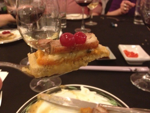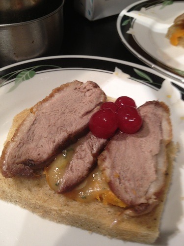 Sage bread, mashed sweet potato, gravy, duck breast, topped with cranberry. Classic. Sort of.