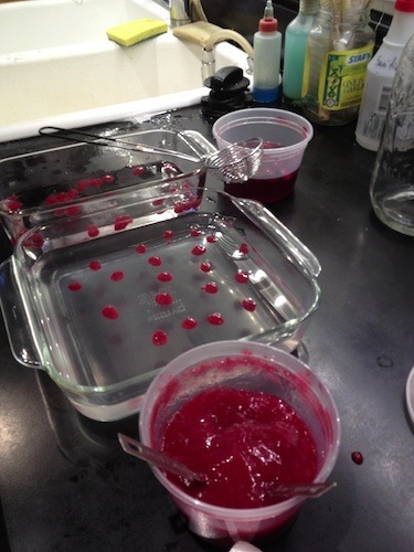 Atop the sliced duck breast, the cranberry. These are reverse-spherified, by mixing the cranberry and blood orange juice with gluco (calcium gluconate) and xantana (xanthan gum) and dropping into an alginate bath. (Molecular gastronomy instructions online at khymos.org and MolecularRecipes.com. First attempt: the juice was still too watery and didn’t cohere in the bath, so corwin mixed in more xanthan gum. We overshot and they were a little too blobby to make perfect spheres, but they came out pretty good visually and taste-wise were perfect. Blood orange was a great juice to mix with cranberry juice, adding some body and sweetness but keeping the brilliant red color.