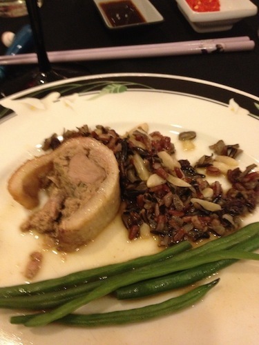 The wild rice and red rice dressing was a mix of those two grains with toasted almonds, currants, and sauteed aromatics (carrot, onion, parsley). The haricots verts were lightly steamed. All of it was doused liberally with duck giblet jus.