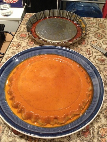 I made one error while taking it out of the oven when it was done–some of the water from the bain marie got into the flan pan. I poured it off and the flan doesn’t seem the worse for wear at all. The next day it unmolded perfectly–perhaps the water even helped with that?