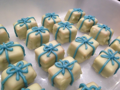 This had to be heated over the double boiler a couple of times during use, but generally the trick was finding the right consistency (viscous but not TOO thick or it eats the cake), dipping the whole piece of cake on a fondue fork until submerged in the slow-moving icing, and then pulling it slowly out, fully coated. Place on a cooling rack and pull the fondue fork gently free and then immediately “spackle” the fork holes with an icing knife. After the icing hardens, break the dripped “feet” off by running the icing knife under the petit four.