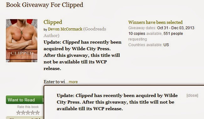 If you're an author considering a Goodreads giveaway, I definitely would recommend it. Though I can't say how the giveaway effects sales (halfway through the giveaway, I signed Clipped with Wilde City Press and removed it from Amazon), at the very least it: