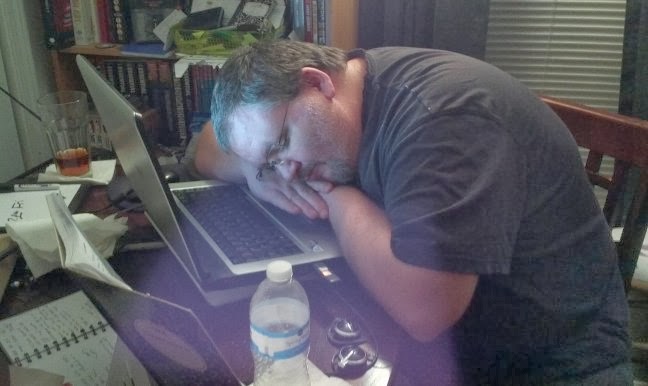 Napping at the keyboard again.I was exhausted tonight (a common state for me of late) so I took an hour nap then settled in for some writing and added a couple thousand words to my current project, a short story due 12/15. The publisher hasn't announced this one yet, but it's a prose anthology of stories based on an existing property that has appeared in comics and prose previously. I'm having fun with the story. It's more on the adult side so I've been able to write cussing, which is always entertaining and not something I get to do often.