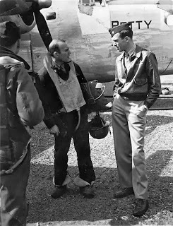 Maj. Jimmy Stewart confers with B-24 crewmen,