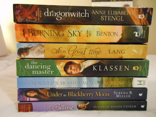 Dragonwitch by Anne Elisabeth StenglBurning Sky by Lori BentonAll in Good Time by Maureen LangThe Dancing Master by Julie KlassenMountain Homecoming by Sandra Robbins Under a Blackberry Moon by Serena B. MillerThe Calling by Suzanne Woods Fisher Yes, the top spine is mainly black (although the red outfit pops!), and All in Good Time could be considered more tan than yellow...but that's pretty close to red, orange, yellow, green, blue, indigo, and violet, wouldn't you agree?