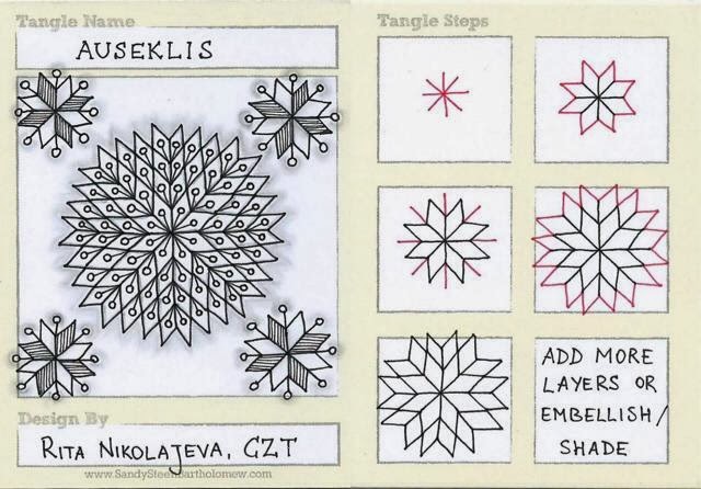 Just before Christmas, I released my ebook, "The Bauble Tree," with step-outs and techniques and ideas... and a challenge to show me what you do with it. Rita Nikolajeva took the challenge even farther by integrating the Bauble tangle with a new tangle of her own design - Auseklis.