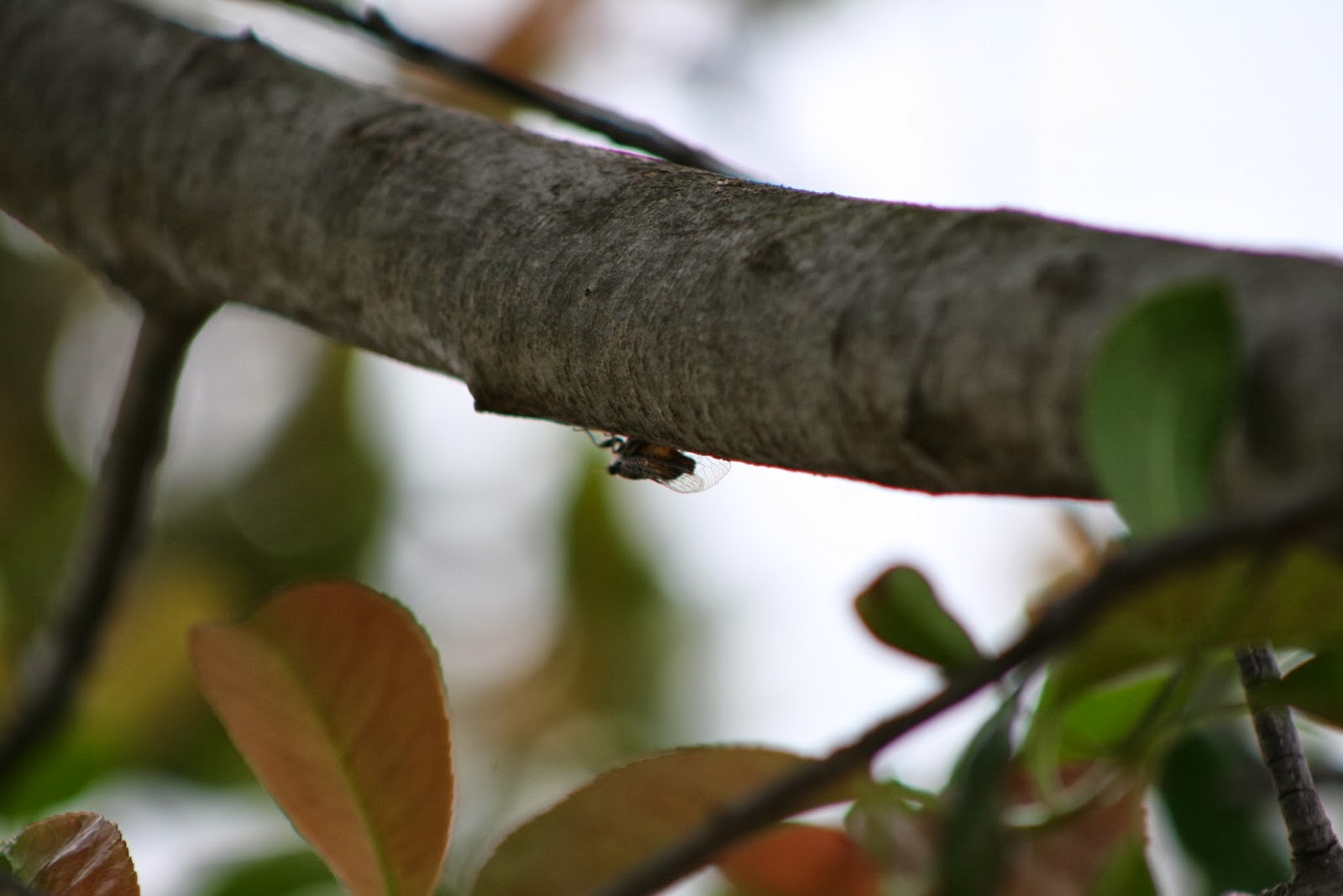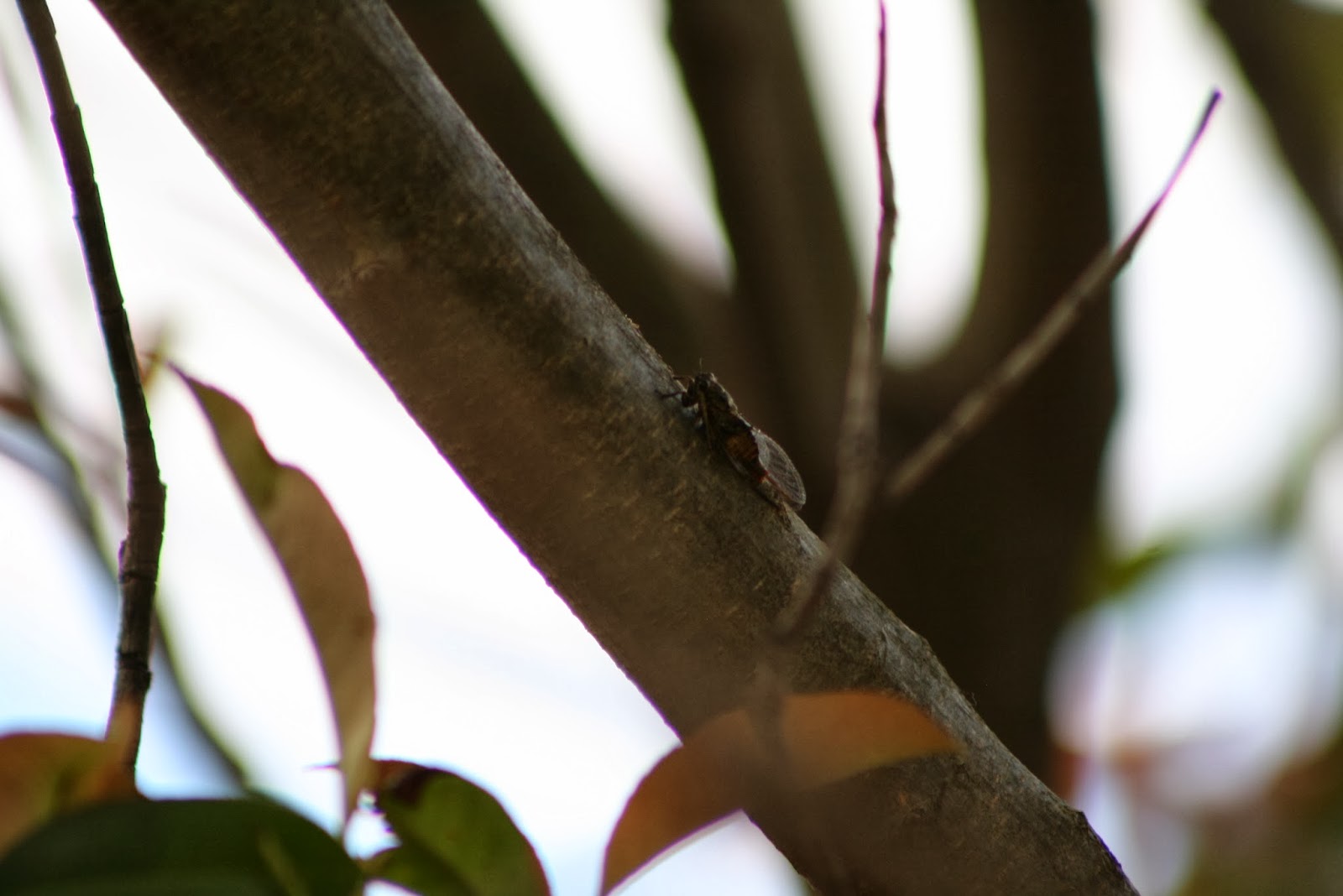 Every Australian summer, you hear them - singing in the trees. Sometimes, on a fine hot day, you'll walk through the shade of a gumtree grove and be showered in a spray of fine droplets. Looking up, you won't see a single cloud - you have just been peed on by the very songsters chirping all around, and above you. I am hoping to get a picture of one of the bigger ones, but this little fellow sang most enticingly in the back yard and I had to hunt him down.