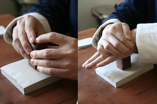 3. Make sure the stamp does not shift on the paper, press with circular motion. But before that, make sure you’re pressing on to a surface that gives (like this pad of paper, or the thick cloth used in calligraphy practice, a hard surface like a wooden table won’t work). Once the chop hits the paper you have to be really careful it stays in one place, otherwise it will blur. To ensure the ink spreads evenly, shift the pressure in a circular motion.