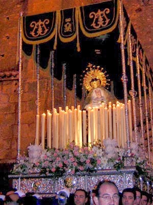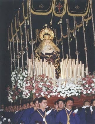 La siguiente fotografía muestra la Virgen de la Misericordia sobre aquellas andas de madera, pero con unos varales de carga distintos (algo más finos y largos) de los que tenía en los primeros años.