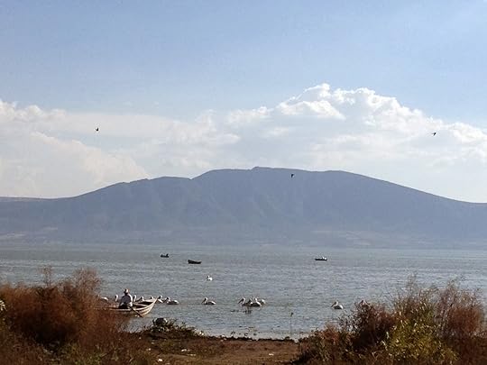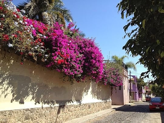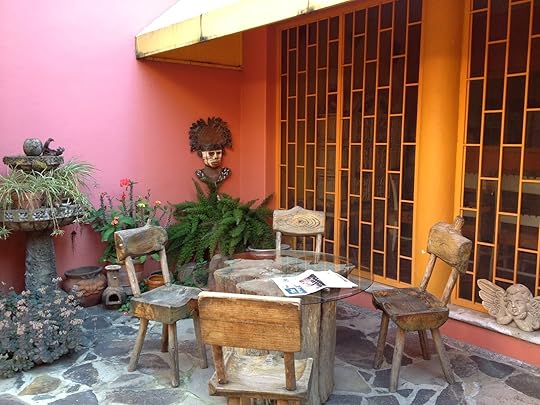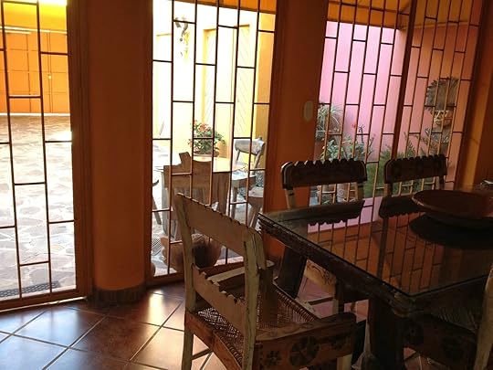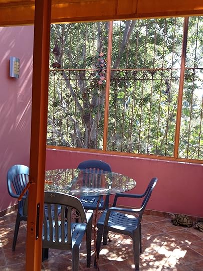 places like Ajijic is the same as Springtime in Colorado----warm and sunny.  Temps are in the high 70s & low 80s.  Sunny every day because the rainy season comes later in the year.  Ajijic is a little over a mile high, like Fort Collins, Colorado.  The two-story house where Deb and I are staying is very pretty with screened porches off all the bedrooms plus a lovely inner courtyard in the front and two rooftop terraces which are perfect for writing.  I promised photos so here they are.  Above is a photo of Lake Chapala which is a block away.    There's a lovely pathway that runs all alongside the lake, filled with people walking, jogging, and taking their dogs out.  Lots of dogs and kitties everywhere.  All that I see are well-fed and relaxed.  :)   Mexico does that to you.  Good food everywhere and relaxing surroundings.   And----believe it or not, Deb and I are writing every day.  :)