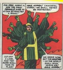 Lee and Kirby also came up with great villains. One of their best was HYDRA, a sinister organization bent on world domination. Hydra’s motto: ‘Cut off a limb and two more shall take its place.’