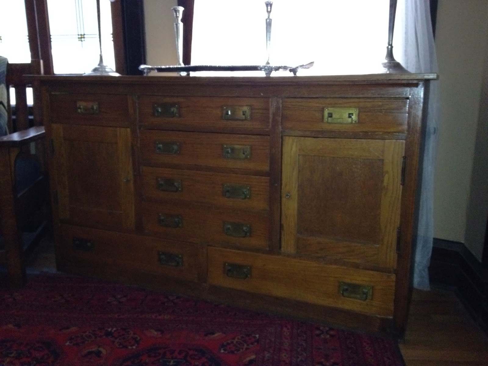 This is an arts and crafts buffet, circa 1930ish, with original brass hardware. And while it looks perfectly lovely in its temporary home in our dining room, we are very excited for it to have a future life...as the vanity in the bathroom! We will be removing the wooden top, installing an under-mounted 4 foot long trough sink with a stone countertop, and installing two wall-mounted faucets in antique brass to match the hardware. Charming Suitor and I love the idea of both of us being able to brush our teeth concurrently without either of us getting beaned by a flying elbow or accidentally spit upon, but neither of us really love the look of two side by side sinks. By doing one long shared sink with two independent faucets we will get the separate functionality we want, but with a more modern, cleaner look.