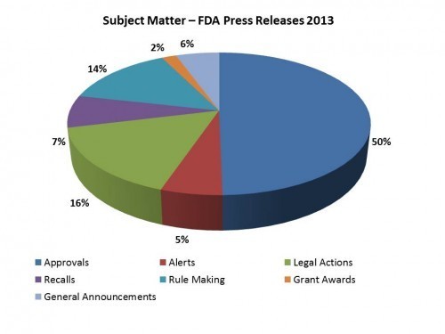 Keeping my eye on FDA, and being most interested in communications, AND having a penchant for looking at patterns through databases, I started categorizing FDA press releases to see what they talked about and in what way. I only started as of January 1, 2013 and tracked them by category. What was the subject matter – an approval? A legal action? Rule making? Then I looked at what sector was affected – Drug, Device, Food/Beverage? Some of the releases are in Spanish, so we tracked that too. Lastly we tracked the product area/use/indication affected and the product name, if there was one involved. In this way, I can look solely at approvals, or approvals in a particular treatment area.