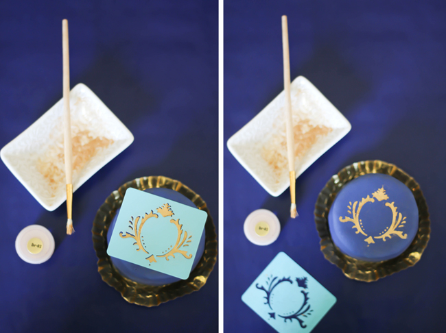Assembly and decoration:2 cups (about 1/2 lb.) ready-made white fondantBlue, black, rose, and lavender gel food colorPlastic food service glovesGold luster dustSmall cup of waterCulinary stencil or other plastic non-toxic craft stencilSmall soft-hair artist’s brushLightly grease a work surface with white vegetable shortening. Knead in 1/2 teaspoon blue gel food color and 1 small dot of black gel food color to a 2/3 cup piece of white fondant. Knead in additional food color if needed to achieve a deep blue saturation. Roll half of the piece out on the greased surface. Lift piece with a rolling pin (or your hands – it’s small enough) and drape over a cake. Smooth fondant down and around the cake and trim the excess with a sharp knife. Repeat process a second cake . Repeat the process tinting 2/3 portion of the fondant with lavender food color, and then the last 2/3 portion with rose.Place a stencil on top of each cake. Tap out a little gold dust onto a clean plate. Dip the paintbrush into water and then into the luster dust; work it into a paint-like paste on the plate with the brush. Repeat dipping/working until your brush is loaded with luster dust “paint”. Gently apply in even strokes over the stencil. Carefully lift stencil to reveal the design.Tips:
