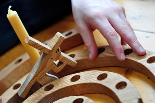I turn towards our Lenten wreath, the path our oldest son made out of oak, the path we mark each of the forty days with a moving forward of the candle, of the symbol of the cross.