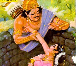 Devayani saw the handsome king. She wished to become a queen to teach Sarmishtai a lesson. She said to yayati, ‘you have grasped my arm and as I am an unmarried girl, you have to accept me as your wife!’‘I only grabbed your arm to help you out of the well. I can’t wed every girl I help. I don’t even know anything about you.’‘I am the daughter of Sukracharyar; my name is Devayani.’‘If you are Sukracharyar’s daughter you are a Brahmin. It is prohibited by shastras for a Kshatriya man to marry a Brhamin girl though a Kshatriya woman could marry a Brhamin man. I can’t go against the shastras in order to marry you.’At that moment Sukracharyar came looking for Devayani. Sukracharyar spoiled Devayani by letting her have what ever she wished to have. Devayani complained to her father and informed him that she had to marry the king.‘What you say about the shastras prohibiting a kshatriya man from marrying a Brahmin girl is correct but I can use my powers to make sure that you are not affected by any sins but if you disappoint my daughter, you will have to face my wrath!’Yayati did not wish to be cursed by Sukracharyar. He agreed to wed Devayani. The Asura King gave many gifts since his preceptor’s daughter was getting married. Devayani made an extraordinary request to the king.‘Along with all these gifts, I wish to take your daughter Sarmishtai as my personal maid servant!’The Asura King acceded to Devayani’s request because of his repect for Sukracharyar.Sukracharyar was worried. He knew that Sarmishtai was beautiful and knew how to conduct herself regally. Over time Yayati could fall in love with the fashionable Sarmishtai and Devayani would be upset. He therefore called Yayati aside and warned him, ‘If you are ever unfaithful to my daughter, you will have to face my wrath!’Devayani and Yayati lived happily and had four sons. The eldest son was named Yadu. One day Yayati went on a hunting trip and Sarmishtai accompanied him. Yayati fell in love with Sarmishtai and secretly married her. They had four sons and the eldest son was called as Puru.After a few years Devayani came across Sarmishtai’s sons and realized that they resembled Yayati. She soon found out the truth and rushed to her father and complained to him.Sukracharyar was seething with anger. ‘May Yayati turn into a decrepit old man!’ he cursed.