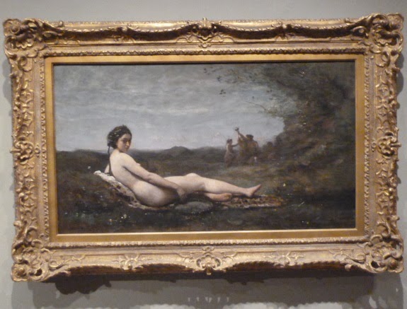 Jean-Baptiste-Camille Corot French (1796-1875) Le Repos (the Repose), 1860, re-worked 1865-70 Corot, whose beloved landscapes grace more museums than just about anyone's, paints this nude as almost an accessory to the landscape. As the leader of the Barbizon movement, he was, in the words of Wikipedia "...a pivotal figure in landscape painting. His work simultaneously references the Neo-Classical tradition and anticipates the plein-air innovations of Impressionism."
