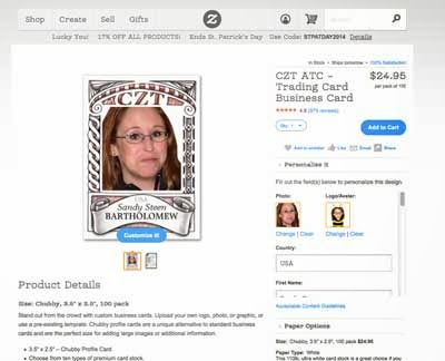 Double check all your info, make sure it all fits and looks nice, then click the "Add to Cart" blue button near the top right. Also notice that there is usually some kind of a special code near the very top of the screen... in this case, it's 17% off for St. Patrick's Day. You'll want to enter that code in the discount box in your shopping cart to get your sale price. Zazzle also offers some really great email only discounts. My favorite, usually once a month or so, is a 50% off Business Cards deal. These ATC sized cards count as biz cards, so that is a fabulous deal!