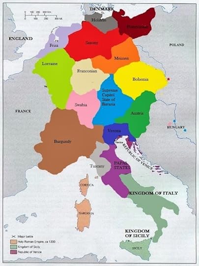 The process that I have been following so far is a circular one, beginning in what is now Hungary and the Hunnish invasion of the dying Roman civilization. Thereafter I have moved south and west. The second graphic shows my progress roughly, with much time spent on Italy. Indeed, that focus continues on as we progress, next, to the region demarcated by the yellow portion of this ellipse. And then, in future posts, we’ll complete and retrace parts of this ellipse again as we approach the end, the fall of Constantinople.
