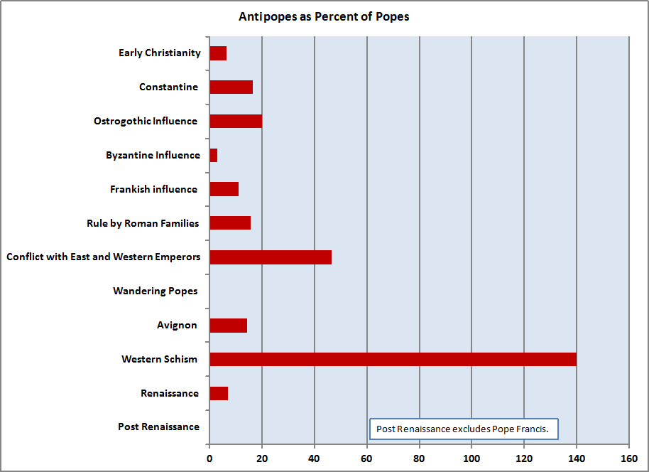 Let me end this now with three graphics I used, initially, to give myself some statistical perspectives on the Papacy. They show the number of popes and antipopes, antipopes expressed as percent of popes, and the average tenure, in years, of the popes in each period. Again, clicking on the graphics will enlarge them. Concerning the second graphic, the percent is calculated by taking all popes in a period, e.g., 31 in Early Christianity, the number of antipopes in the same period (2), dividing the antipopes by popes, and multiplying by 100. For purposes of these graphics I include all periods, including the post-Renaissance period but excluding the reign of Pope Francis—whose tenure, for instance, is not yet known.