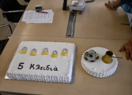 Είναι κοινό μυστικό πια, πως μια και συγκεκριμένη ημερομηνία υπογράφω το συμβόλαιο για το νέο βιβλίο και αυτή είναι η 23η Σεπτέμβρη! Μόνο που φέτος υπήρχε μια ιδιαιτερότητα καθώς τα συμβόλαια ήταν ΔΥΟ!! Βλέπετε μετά από δώδεκα χρόνια....οι πρόσφυγες γυρίζουν σπίτι τους! Γι αυτό και οι δύο τούρτες. Κι αυτό συνήθειο το έχω, να κάνω πάντα παραγγελία μια τούρτα για κάθε νέο βιβλίο και να κερνάω το εκδοτικό μου σπίτι για το καλό. Αριστερά λοιπόν η τούρτα για το νέο βιβλίο που θα έχει τίτλο "Τα πέντε κλειδιά" και δεξιά... ένα μυρωδάτος καφές στην χόβολη που θα σερβίρεται από δω και πέρα από τις εκδόσεις Ψυχογιός. Το πρώτο μου βιβλίο με το τίτλο "Την μέρα που σε γνώρισα" επανακυκλοφορεί με τον αυθεντικό τίτλο, αυτό που του έδωσα όταν το έγραφα: "Ήταν ένας καφές στην χόβολη".Δεν ξέρω ακόμα πότε θα κυκλοφορήσει, αν δηλαδή είναι μέσα στο 2013 ή τους πρώτους μήνες το 2014, αλλά είμαι πολύ χαρούμενη που όλα μου τα βιβλία, μαζεύτηκαν πια, κάτω από την ίδια εκδοτική στέγη!