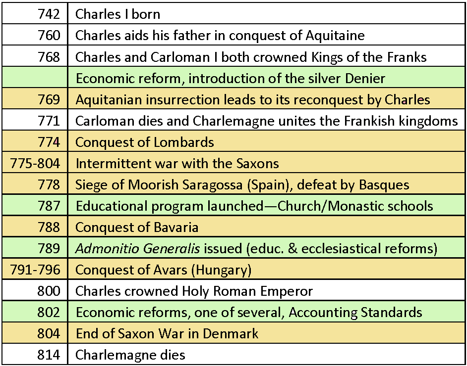 Now some notes to the Timeline. Carloman I was Charlemagne’s younger brother. Upon Pepin’s death, in conformity with Frankish custom, Francia was split between Charles and Carloman. This custom caused consolidated realms to fall apart, alas. The Carolingian empire held together until 840, outlasting Charles’ own death by 27 years, only because, at his death, Charles only had one surviving son, Louis the Pious. After Louis’ death the Holy Roman Empire fell apart—to be reconstituted, but now with a Germanic focus, by Otto I who was himself a direct descendant of Charlemagne.