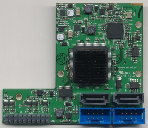 In a nutshell, the oscilloscope offers two 8-bit channels at 1GSPS or one 8-bit channel at 2GSPS with an analog bandwidth of up to 900MHz. As a side bonus we also wired in a set of 10 digital channels that can be used as a simple logic analyzer. Here’s some high resolution photos of the oscilloscope expansion board: