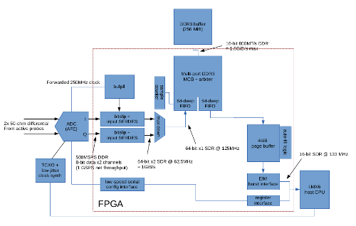The FPGA is configured to talk to an ADC08D1020 dual 1GSPS ADC, designed originally by National Semiconductor but now sold as TI. The interface to the ADC is a pair of 8-bit differential DDR busses, operating at up to 500MHz, which is demultiplexed 1:8 into a 64-bit internal datapath. Upon receipt of a trigger condition, the FPGA stores a real-time sample data from the ADC into local DDR3 memory, and later on the CPU can stream data out of the DDR3 memory via the Linux Generic Netlink API. Because the DDR3 memory’s peak bandwidth is only 1.6GSPS, deep buffer capture of 256 Msamples is only available for net sample rates below 1GSPS; higher sample rates are limited to the internal memory capacity of the FPGA, still a very usable 200 ksamples depth. The design is written in Verilog and consumes about 15% of the FPGA, leaving plenty of space for implementing other goodies like digital filters and other signal processing.